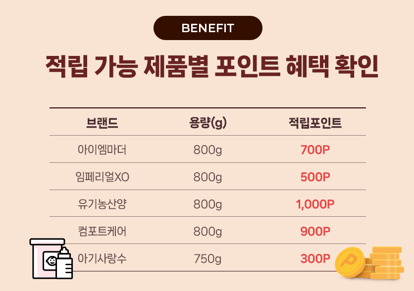 아임메다, 임페리얼XO, 유기농산양, 컴포트케어, 아기사랑수 제품마다 포인트 혜택이 다르니 적립 포인트를 확인해 보세요. 유기농산양이 제일 높으며 1,000포인트입니다.