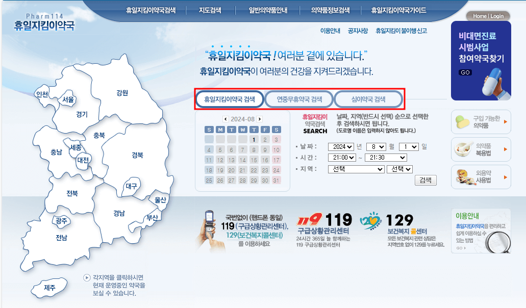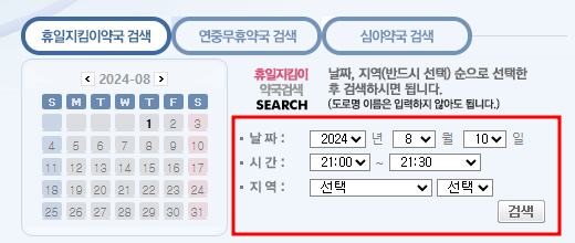 원하는 날짜와 시간을 지정하여 검색을 할 수 있어 명절 등 공휴일일 때 미리 알아보고 갈 수 있습니다.