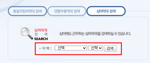 지역 설정으로 심야에도 갈 수 있는 심야 약국을 검색할 수 있습니다.