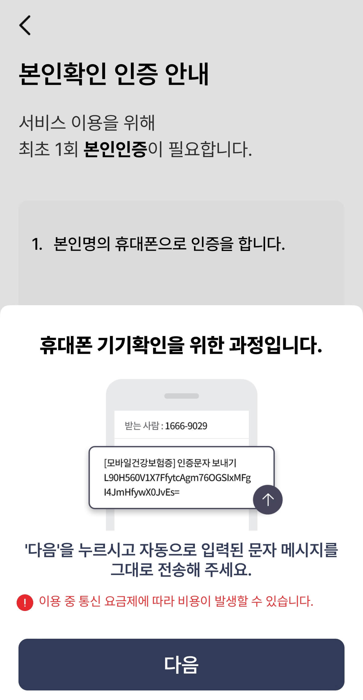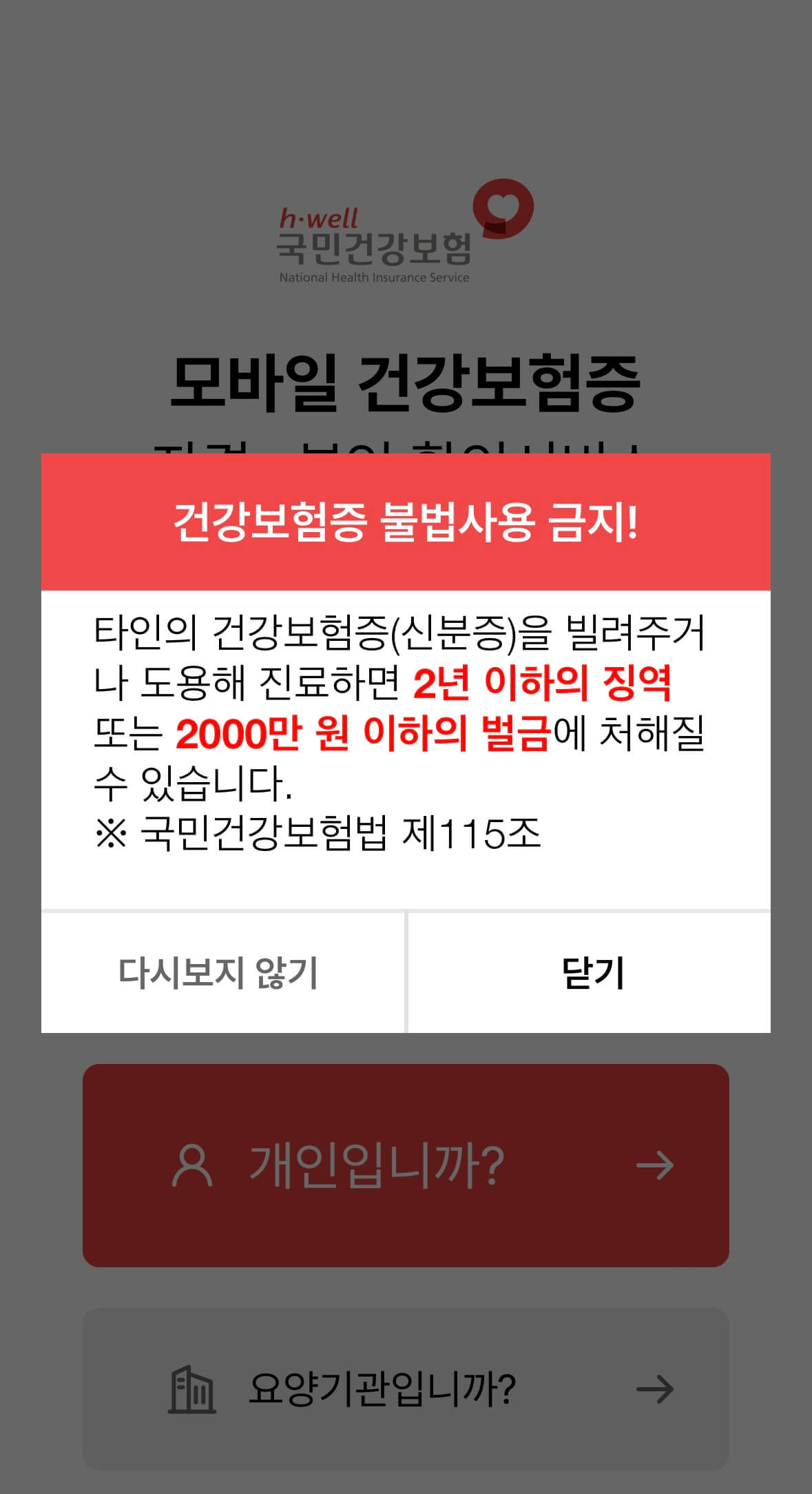 ② 건강보험증 대여 및 도용은 불법이라는 안내 문구 확인 후 넘어갑니다.