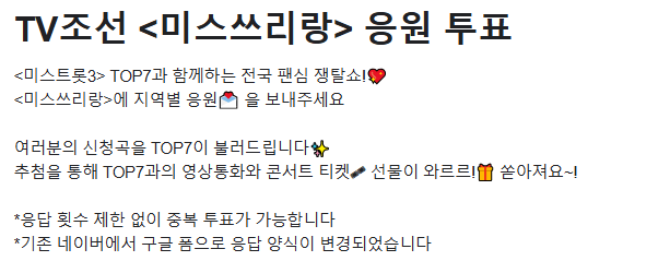 미스트롯3 TOP7의 팬이 되어 미스쓰리랑을 보시는 분들이 많을 것이라 예상되는데요. 미스쓰리랑에서는 지역별 응원 투표를 통해 투표를 하면 TOP7의 깜짝 선물을 받을 수 있다고 합니다. 또한 신청곡을 보내주시면 TOP7이 신청곡을 직접 불러드린다고 하니 좋은 기회겠죠?