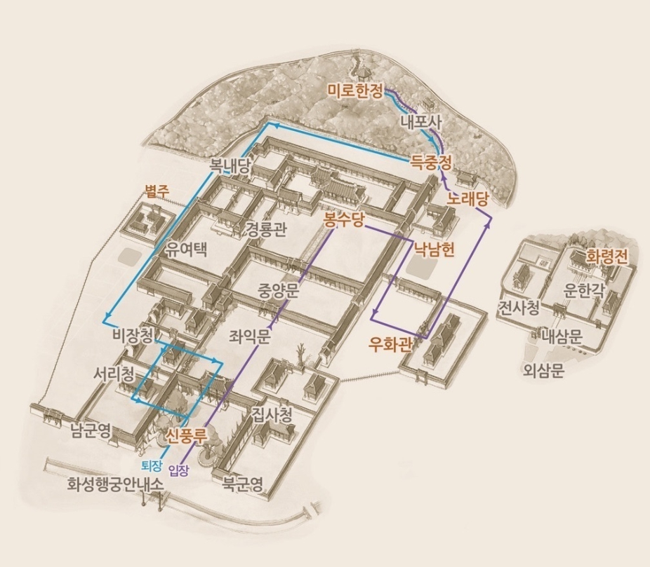 수원문화재단에서 추천하는 화성행궁 야간개장 동선입니다. 아래와 같이 산책을 하게 되시면 크게 다 둘러 보실 수 있습니다.