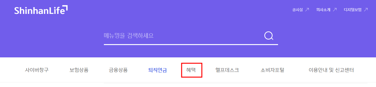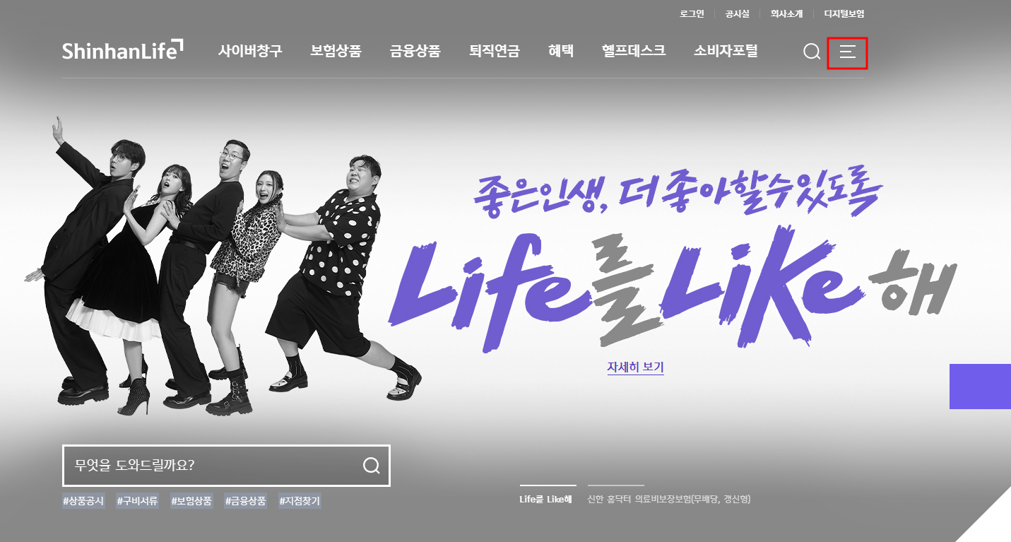 ① 신한라이프를 검색하여 접속한 후 오른쪽 상단 메뉴를 누릅니다.