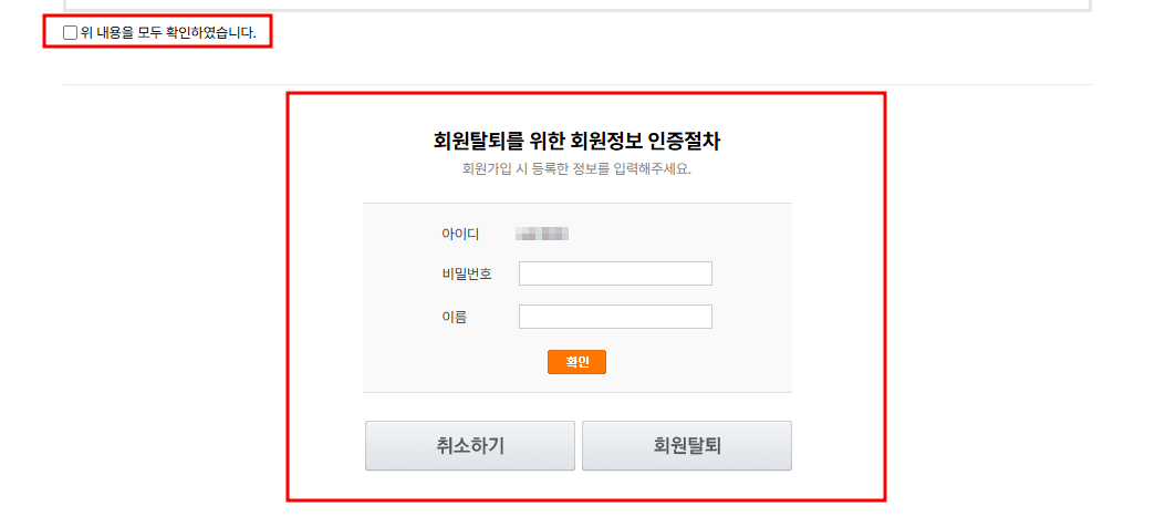 ⑦ 내용을 모두 확인했다는 체크를 해주고 다시한번 인증을 한 후 회원탈퇴를 누르면 탈퇴 완료입니다.