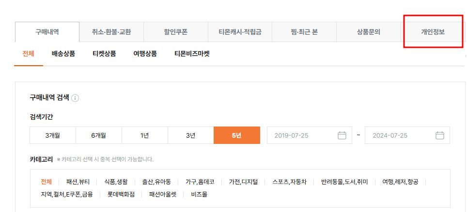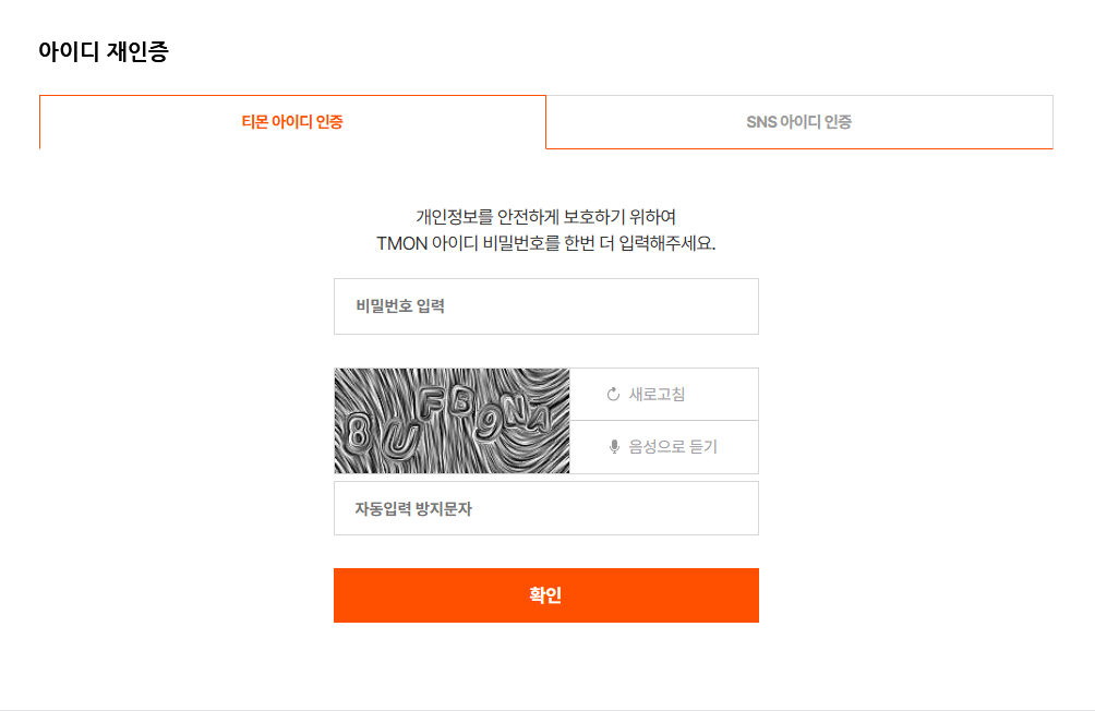 ④ 개인정보를 누르면 아읻디 재인증을 하라고 하여 티몬 아이디 인증으로 재인증을 해줍니다.