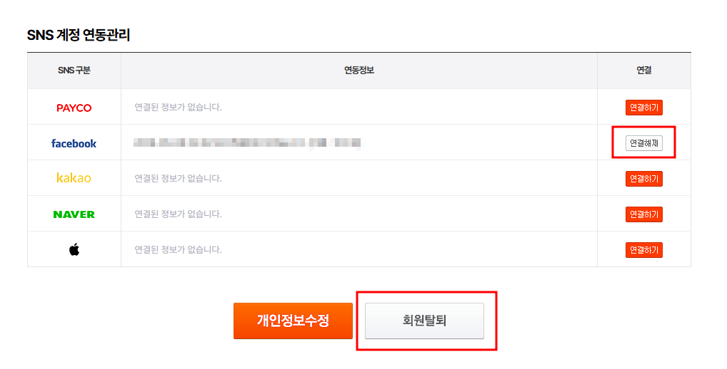 연결해제를 눌러도 아무 반응이 없었는데 이 것은 페이스북에서 연결을 해제해야 되기 때문입니다. 먼저 회원탈퇴를 눌러줍니다.