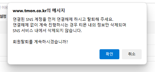 ⑥ 이렇게 SNS 계정 연결을 해제하라는 말이 나오는데요 저는 탈퇴먼저하고 SNS에서 해제해 주었습니다. 확인을 눌러줍니다.