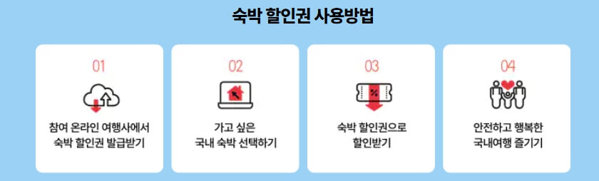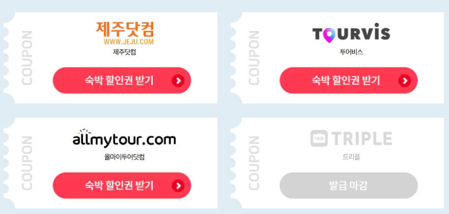 제주닷컴, 투어비스, 올마이투어, 트리플, 여기어때 등 41개의 기업체가 참여하며 할인권을 발급받을 수 있고 사용할 수 있습니다. 인기가 많은 온라인 여행사들은 단시간 내에 발급이 마감 되오니 이 점 유의하시어 빨리 얻을 수 있게 시간 내에 대기하시기 바라겠습니다.