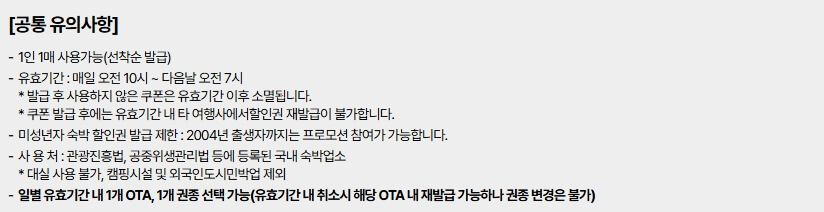 - 미성년자 숙박 할인권 발급 제한으로 2004년 출생자까지는 프로모션 참여 가능합니다.